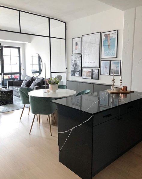 This stunning kitchen space by Jannike Ebbing features Marquina surfacing, completing a modern and elegant design.