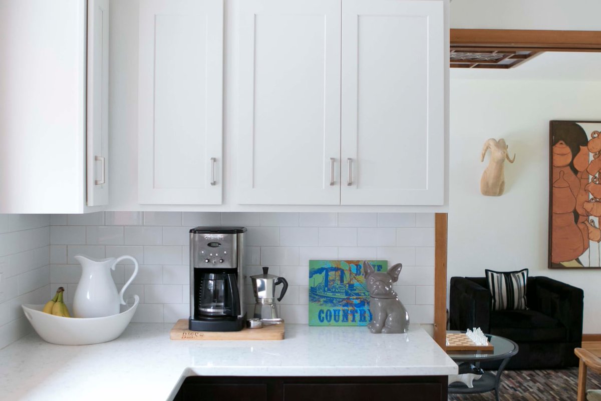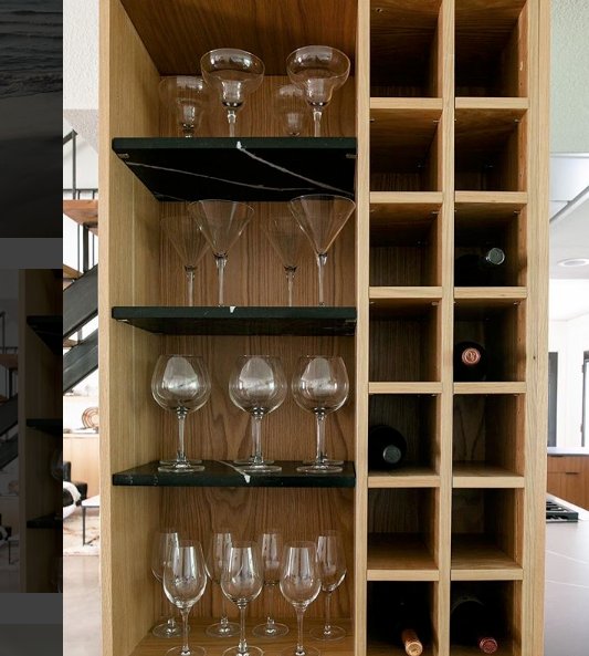 Silestone shelving? Yes, please! uses Marquina to store her wine glasses, accenting her Marquina kitchen island around the corner.