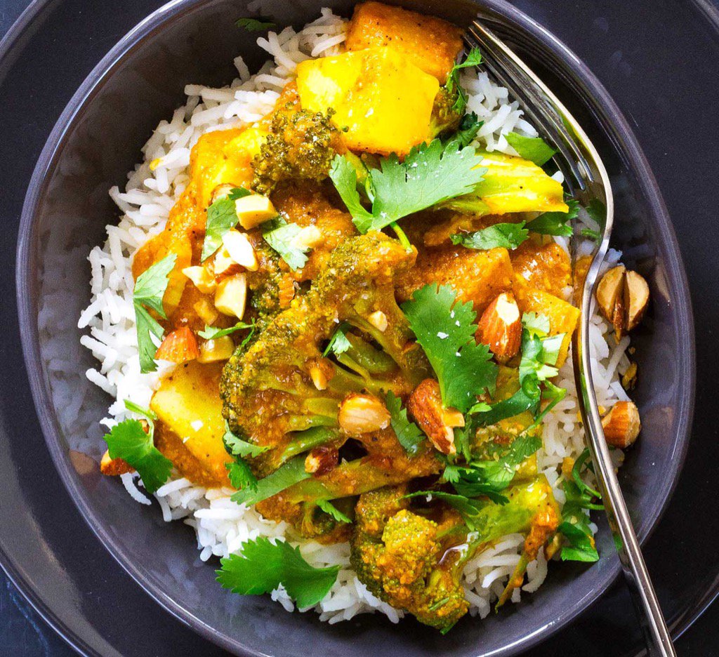 Vegetarian potato and broccoli curry now . No cream, no coconut milk. Sauce thickened with almonds.