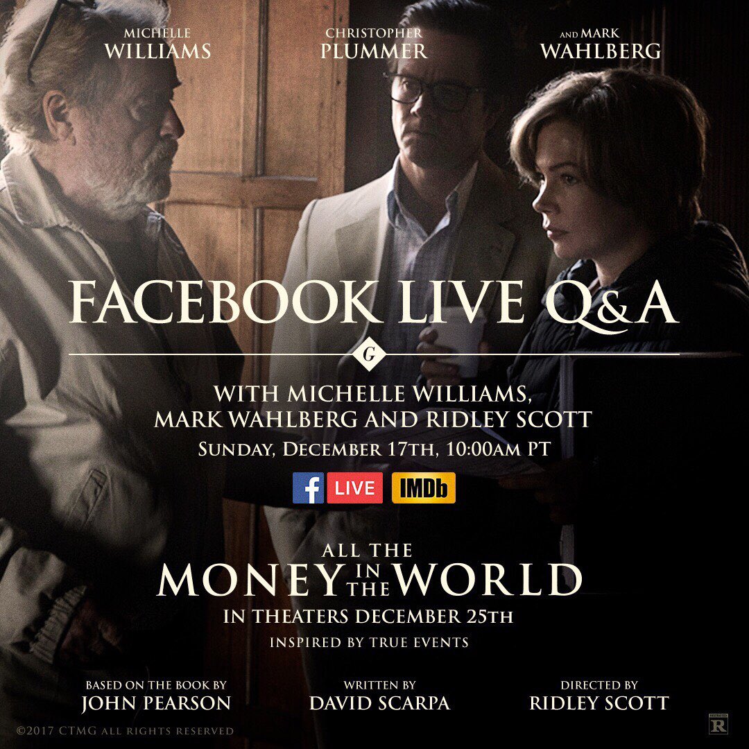 #AllTheMoney stars Michelle Williams, Mark Wahlberg and Director Ridley Scott for a LIVE Q&A with@IMDb TOMORROW at 10 AM PT.pic.twitter.com/90ityVZ92F