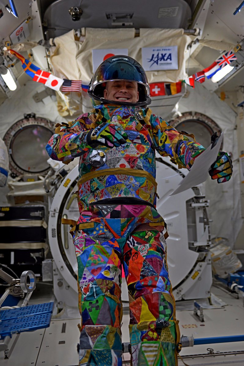 Honored to wear the UNITY spacesuit made of paintings from cancer-fighting kids around the world. They’re amazing!