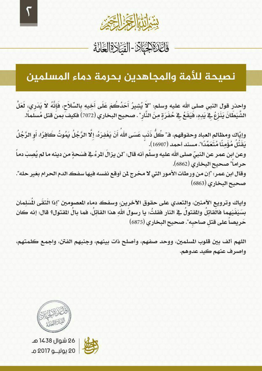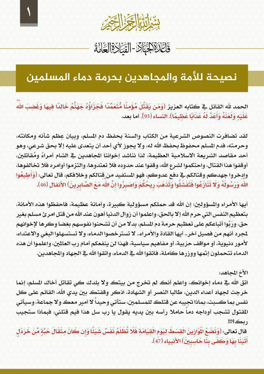 Al Qaeda released a 2-page statement offering advice to the mujahideen on "the sanctity of Muslim blood" - just after infighting in Syria: