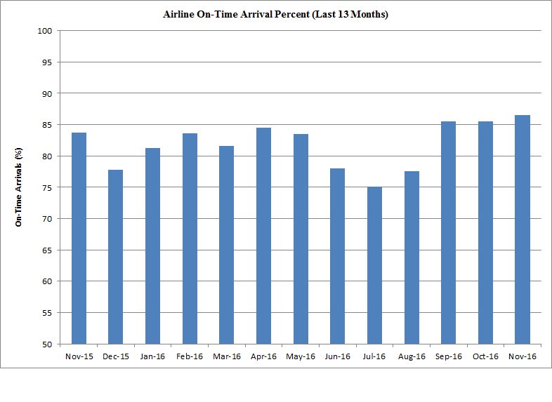 86.5pct of November flights arrived on-time, 0.29pct canceled – lowest on record