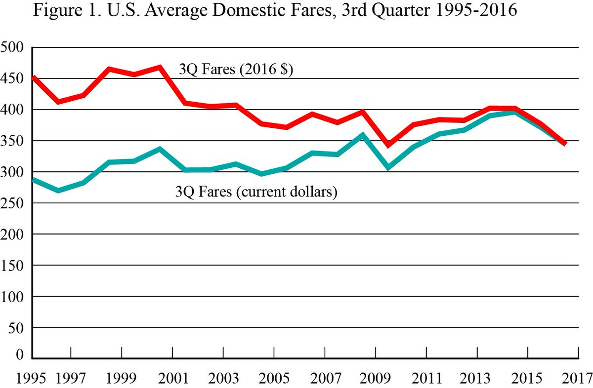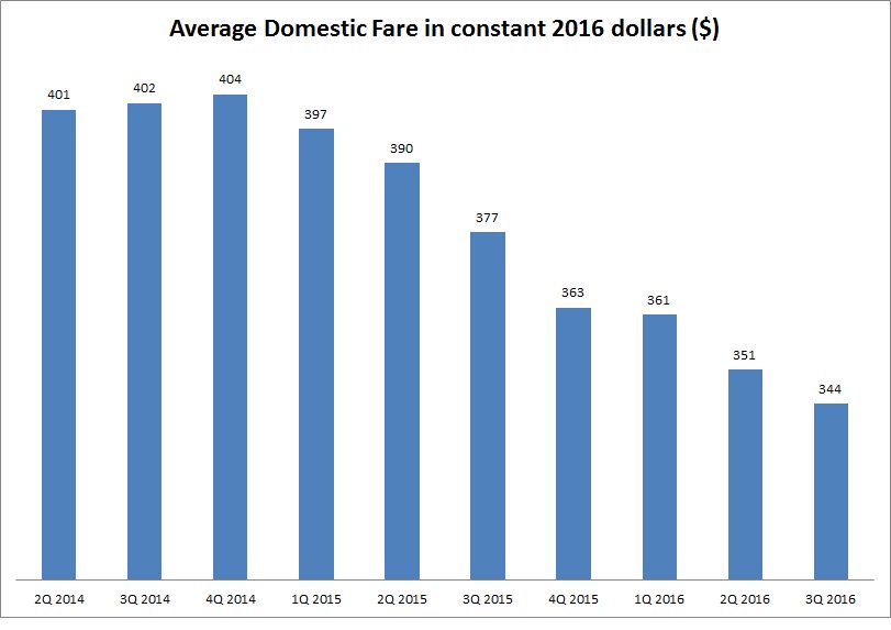 One year: 3Q2016 $344 domestic fares inflation-adjusted down 8.8pct from $377 3Q 2015