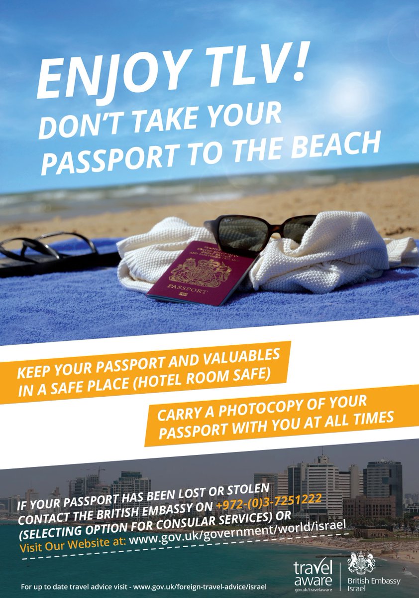 Planning a vacay on the beach? Be responsible and leave your passport in a safe place. Lost your travel doc? Contact us on +972(0)3-7251222pic.twitter.com/dQkmbU6JJd