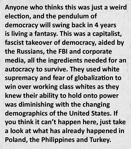 This is NOT normal. This was a capitalist takeover of democracy, aided by Russia, FBI & corporate media, all the ingredients needed for autocracy to survive.