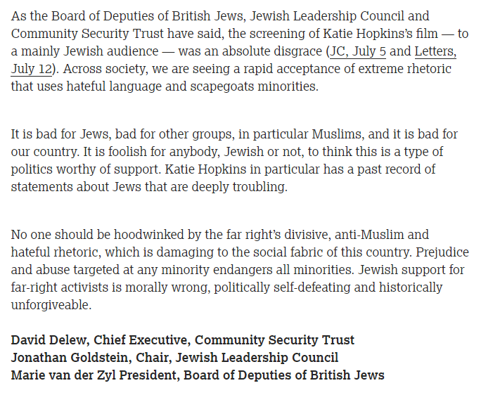 @JewishChron today, with@JLC_uk &@CST_UK, we repeat our condemnation of Katie Hopkins' vile, Muslim-baiting film, and say: "Jewish support for far-right activists is morally wrong, politically self-defeating and historically unforgiveable."pic.twitter.com/zUad4LYi5u
