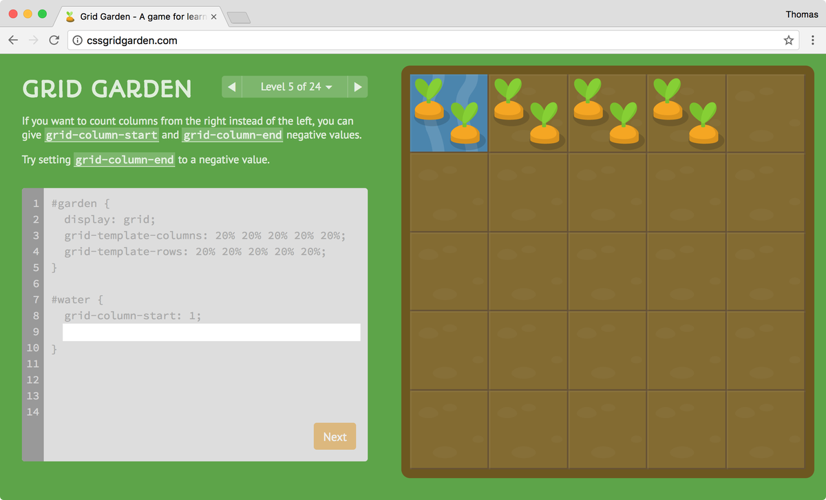 Grid Garden: a coding game for learning CSS grid. Cultivate those carrots with this sequel to Flexbox Froggy! http://cssgridgarden.com/ pic.twitter.com/K8K8t7OhJj