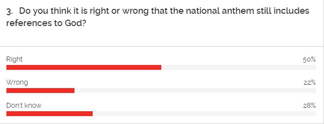 50% of Brits think it is right that God is mentioned in the national anthem - only 22% think it is wrong https://yougov.co.uk/opi/surveys/results#/survey/38a3a410-51ad-11e7-81f3-2ab0a50a8b9c/question/bc85d910-51ad-11e7-81f3-2ab0a50a8b9c/toplines …pic.twitter.com/ZhQYc0DH6t
