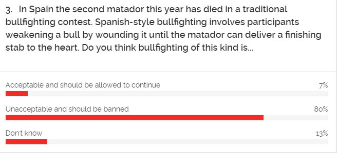 Following the death of the second matador this year, 80% of Brits want to see bullfighting banned https://yougov.co.uk/opi/surveys/results#/survey/75c6bfe0-54db-11e7-862a-1eb0da735179/question/c8b4e9c0-54db-11e7-bfce-be36d6dc7ab1/toplines …pic.twitter.com/dGbzADkQdg
