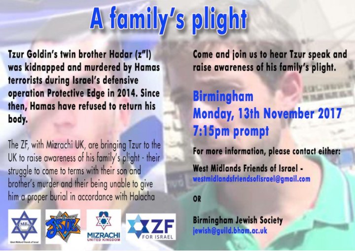 #Hillel as@TzurGoldin tells the story of his brother’s kidnap and murder during 2014 Operation Protective Edge. Thank you@WMFofIsrael and@BirminghamJSoc for hosting us!#BringHadarHome!pic.twitter.com/BCfGUTBbtE