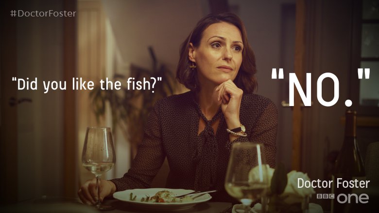 #DoctorFoster over. She’ll either: a) reveal your secrets b) rummage through your drawers c) offend your monkfishpic.twitter.com/flbTcBOlnY