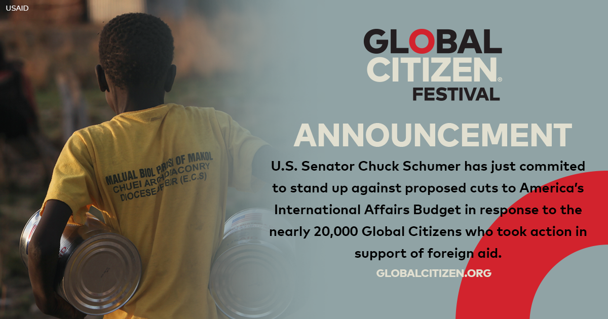 #GlobalCitizens who took action,@SenSchumer hears you! He will oppose cuts to the International Affairs Budget#GCFestpic.twitter.com/4BflpUUE2n