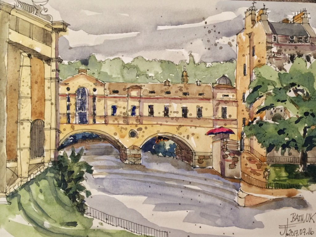 @janefhannah uses line, light, and color to render Pulteney Bridge, in Bath, UK. https://discover.wordpress.com/2017/09/06/roman-baths/ …pic.twitter.com/cXWTf9gGzX
