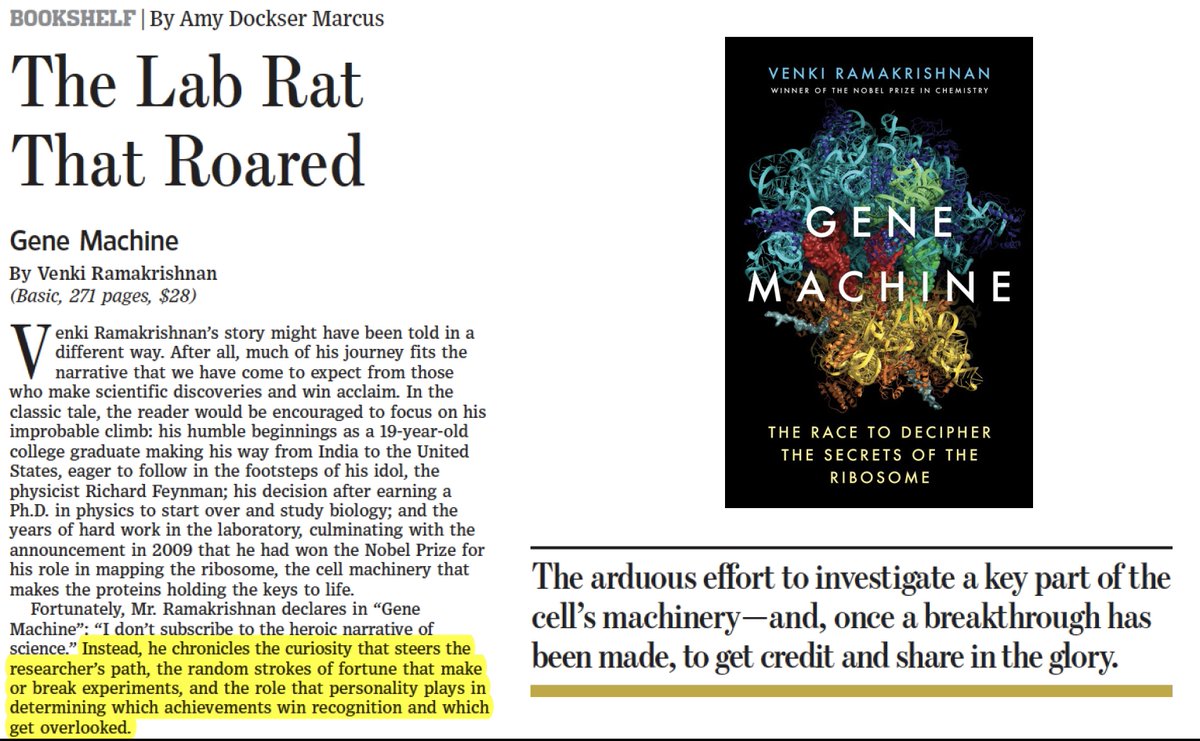 Review of Gene Machine, Venki Ramakrishnan's remarkable story of uncovering the structure of the ribosome and molecular basis for protein translation https://www.wsj.com/articles/gene-machine-review-the-lab-rat-that-roared-11545264371 …
