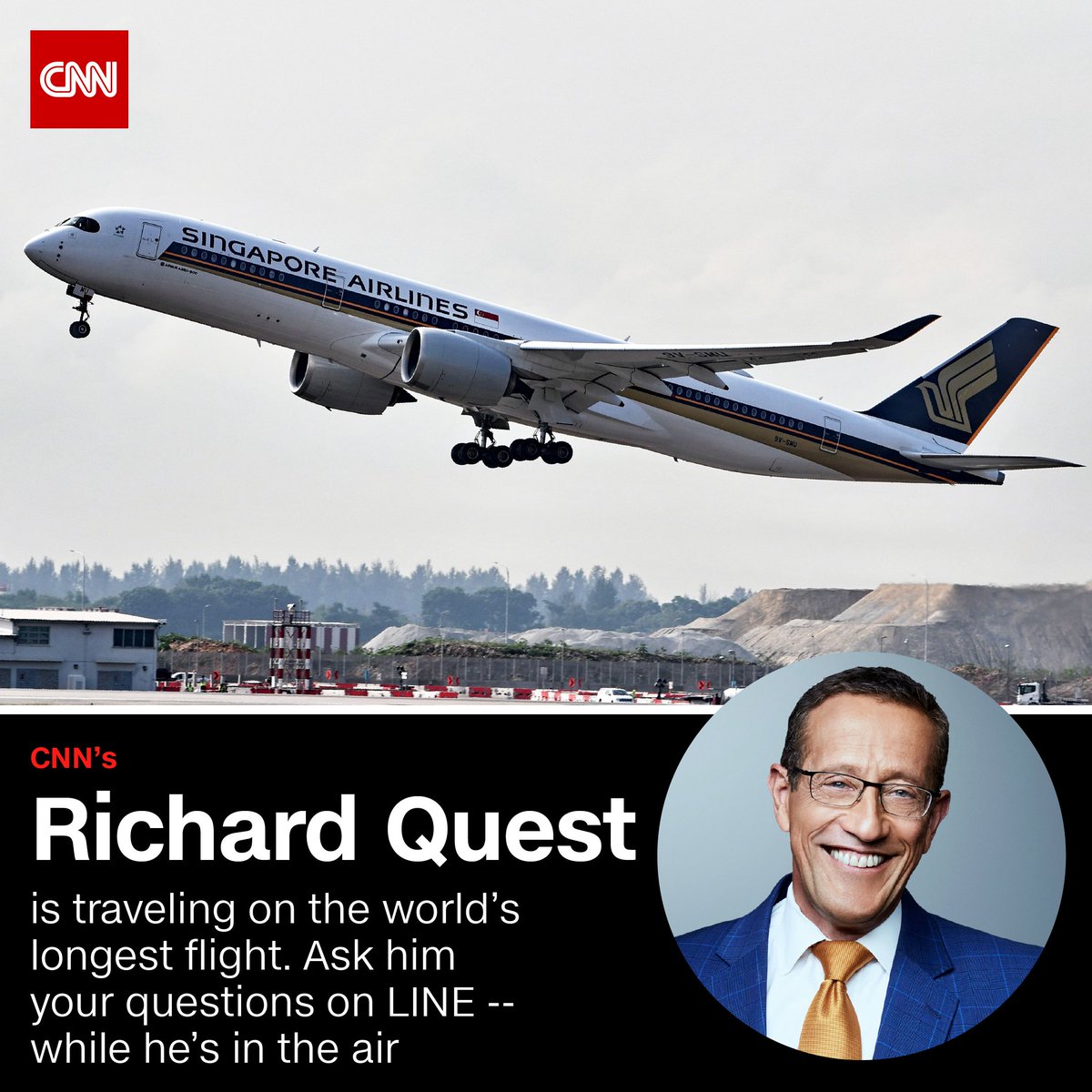 CNN's Richard Quest is reporting live from the world's longest nonstop flight, from Singapore to New York, on Oct 11-12: https://cnn.it/2CGlWfe He will be live on LINE answering your questions from 03:30ET on Oct 12. Download & follow CNN on LINE: https://cnn.it/2CE4acK pic.twitter.com/MIXADYpdup