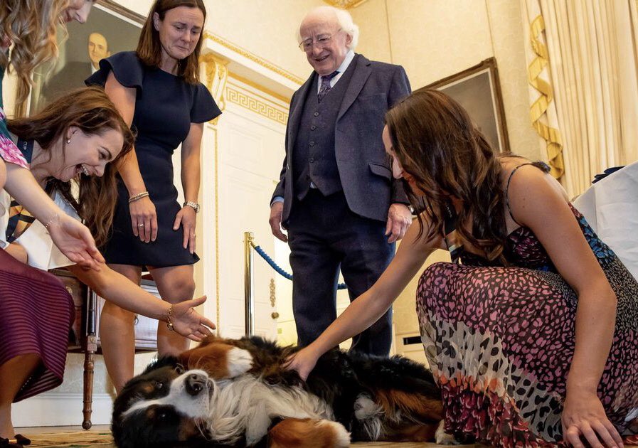 #DailyHiggins we have chosen this photo taken at the reception in the Aras for the@irishhockey women’s team earlier this year. The players were clearly taken with the ‘Brod’ the dog. The President keeps two dogs ‘Brod’ & ‘Sioda’