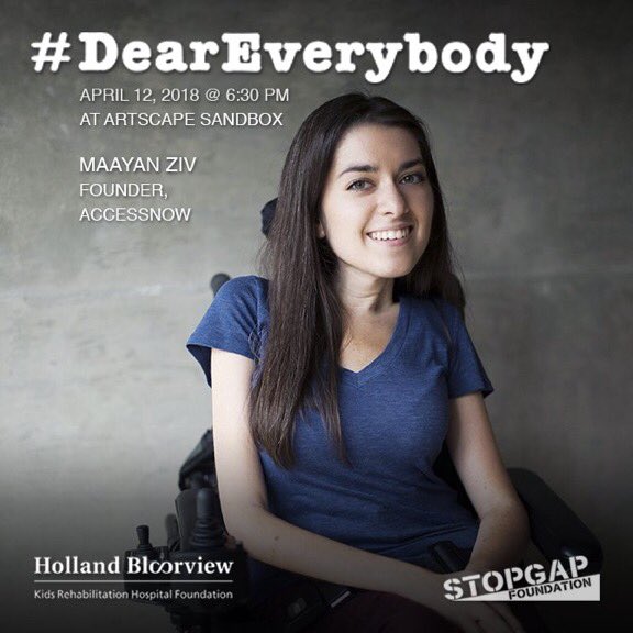 @maayanziv will be joining us as a panellist at the#DearEverybody event on April 12! She is the founder of@AccessNowApp, an app that utilizes crowd-sourcing to map the accessibility status of places around the world. Tickets for the event at: http://deareverybodytalk.eventbrite.ca pic.twitter.com/sXdUACOIqX