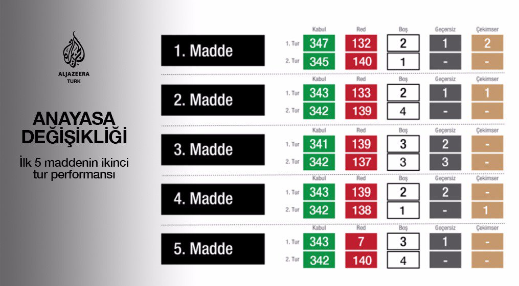 İnteraktif | Meclis Genel Kurulu'nda görüşülen maddeler ne öngörüyor? İlk tur ve ikinci turda kaç oy aldılar? http://ajtr.me/54qd pic.twitter.com/ITN5sfK26i