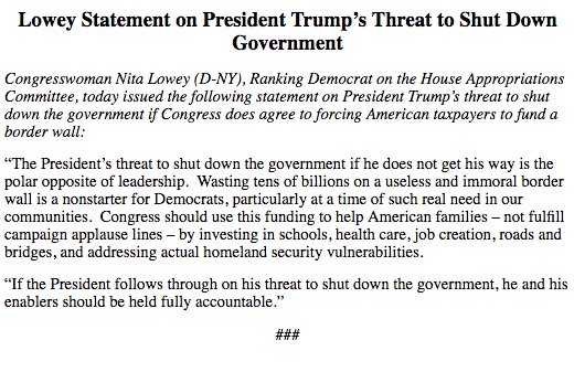 @NitaLowey says Trump threatening a government shutdown "is the polar opposite of leadership"pic.twitter.com/f996DCgT5r