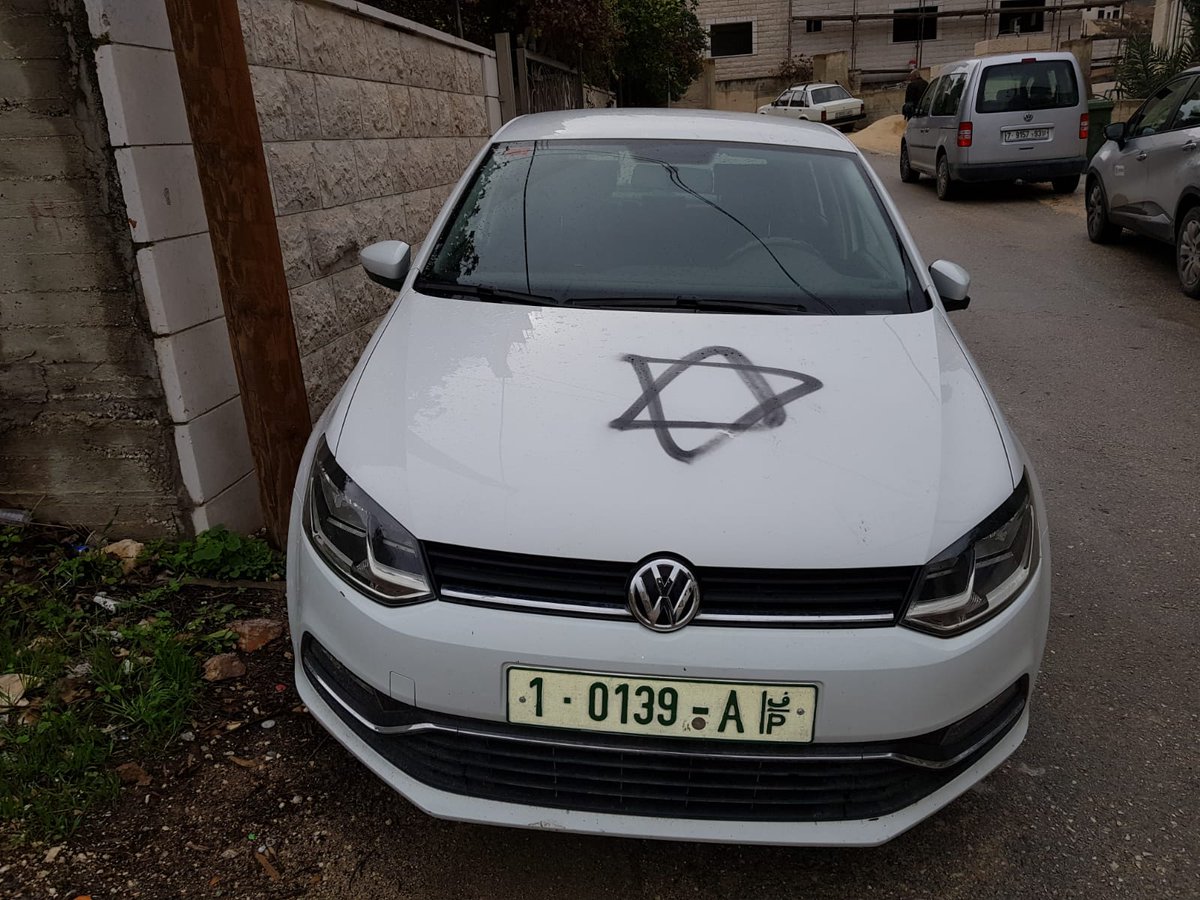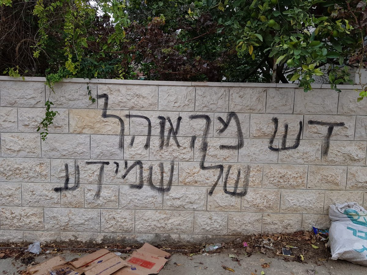 כשעה קודם לכן, 2 אנשים נכנסו לעסירה אלקבליה וניקבו את גלגליהם של כ-12 רכבים. לצד סמלי מגן דוד, ריססו כתובות נאצה על קירות של בתי מגורים. נכתב, "ד"ש מהאוהל של שמידע" ו-" תלחמו באוייב לא באוהב".pic.twitter.com/Bm9T5usixH