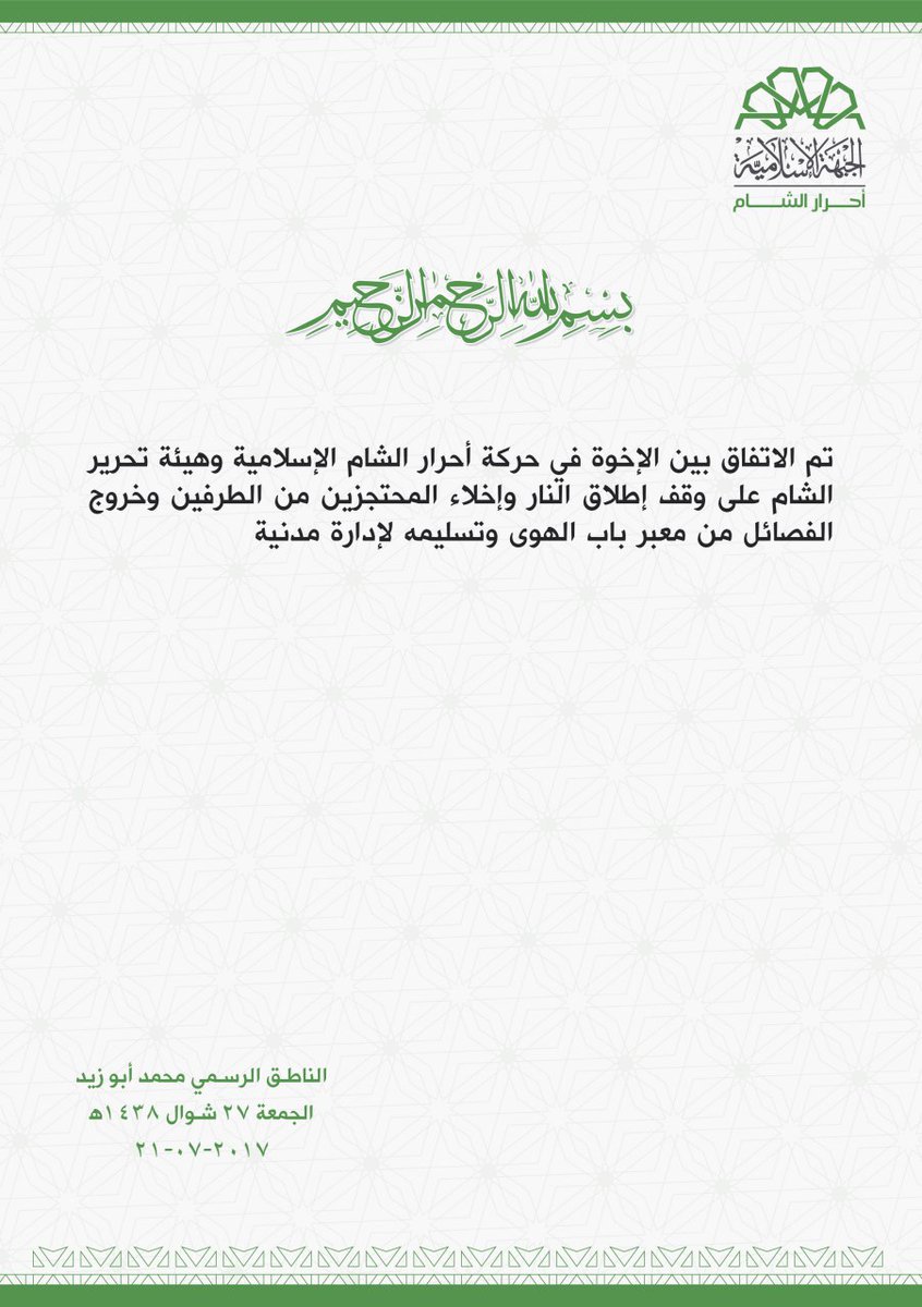 Ahrar: we'll hand over Bab Hawa to civilian administrators. In other words, they lost; question is if Tahrir takes a slice or the whole pie.