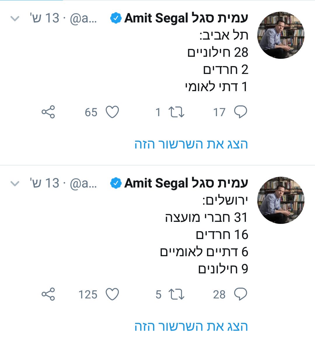 מת על ירושלים ועל הגיוון שלה, אבל סגל "שכח" כמה מספרים: ירושלים - 25 גברים, 6 נשים תל אביב 21 גברים, 10 נשים ירושלים -31 יהודים, 0 ערבים תל אביב - 29 יהודים, 2 ערבים ירושלים - 31 סטרייטים, 0 להט"ב תל אביב - 26 סטרייטים, 5 להט"ב (לפחות)pic.twitter.com/Sursr5nHAY