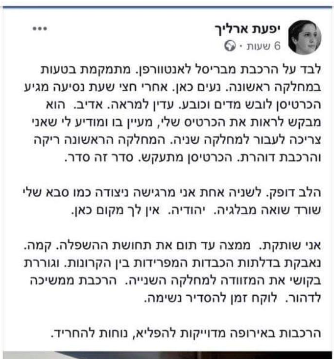 יפעת ארליך, חברת הכנסת לעתיד מ"הבית היהודי", תדאג לבטל את המחלקה השנייה. מעתה והלאה - כולנו מחלקה ראשונה. אף אחד לא יחוש יותר כמו ניצוד שואה, במיוחד לא בשעות העומס של הרכבת, כאשר קנה רובה צה"לי מופנה ישר לתוך הפרצוף שלך.pic.twitter.com/FYel0amfh5