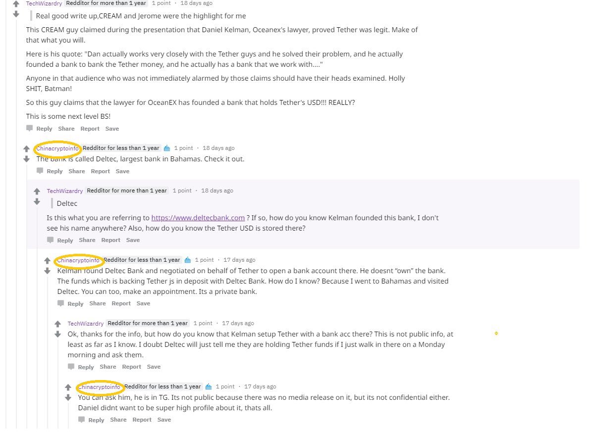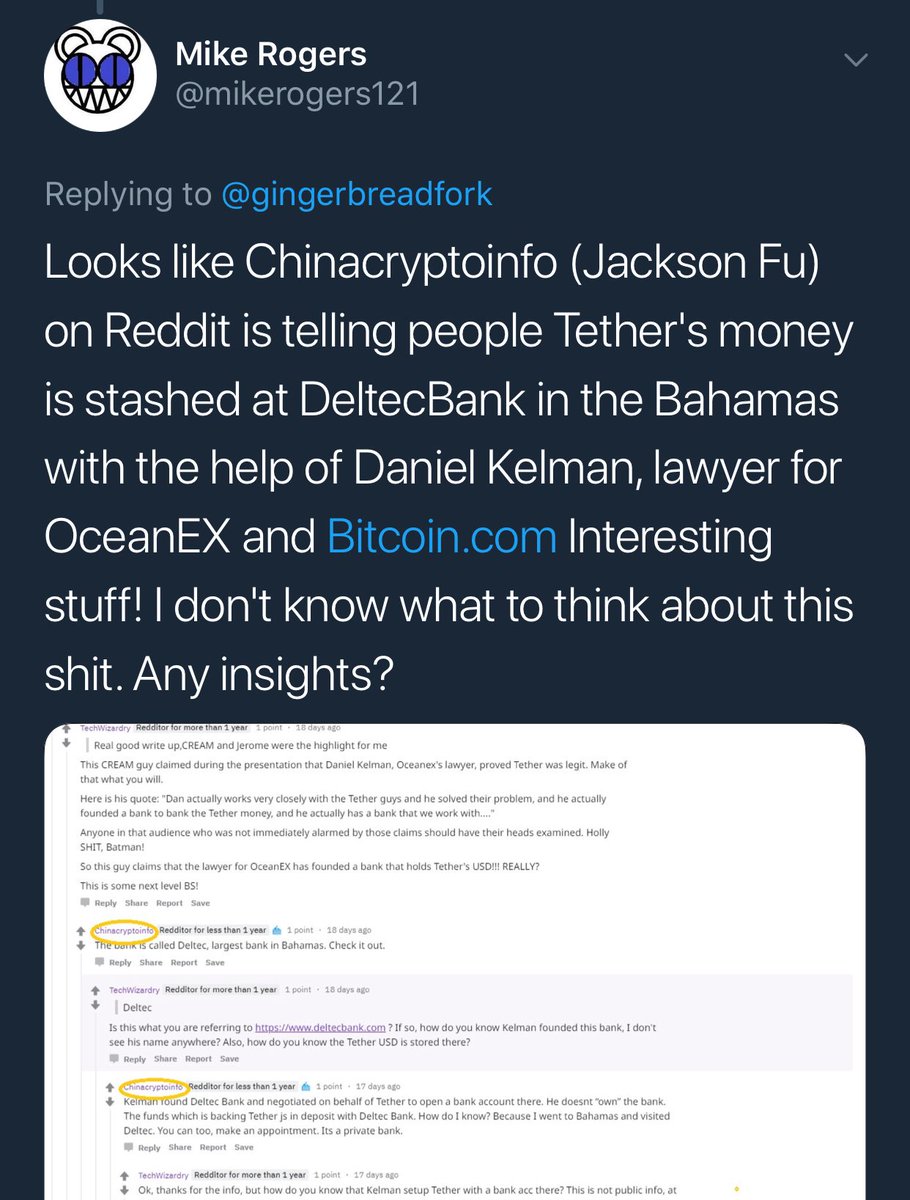 Looks like Chinacryptoinfo (Jackson Fu) on Reddit is telling people Tether's money is stashed at DeltecBank in the Bahamas with the help of Daniel Kelman, lawyer for OceanEX and http://Bitcoin.com Interesting stuff! I don't know what to think about this shit. Any insights?pic.twitter.com/FhxxD9p29N