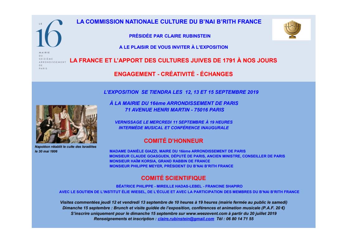 INVITATION Exposition organisée par la Commission du : La et l'apport des cultures juives de 1791 à nos jours : Engagement - Créativité - Echanges. Les 12, 13 et 15 septembre à la à Paris. Venez nombreux.