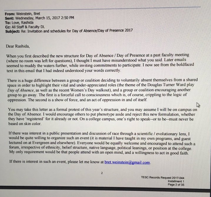 INSANE Evergreen Students: 'no whites at school' = not racist Same Students: thoughtful email why demanding no whites is wrong = racist