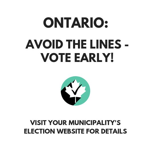 #Ontario: Avoid the lines on October 22nd and vote EARLY! Advanced polls for municipal elections across the province are open or are opening soon. Visit your municipality's election website for info on when and where you can cast your ballot.pic.twitter.com/DGo6HDY2M5