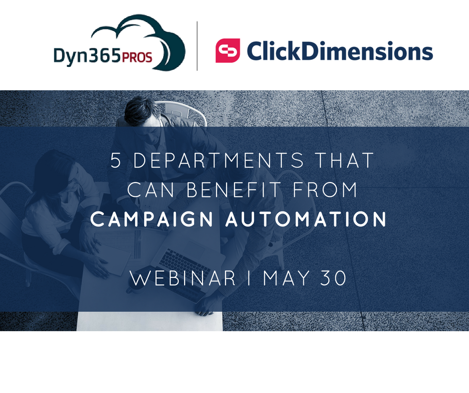 @Dyn365Pros and ClickDimensions for informative webinar where we will take a look at the benefits of campaign automation, best practices, and example campaign scenarios for five different departments on May 30th at 10:00 am PDT.#clickdwebinar https://okt.to/muY62g pic.twitter.com/LM7nGjCAtM