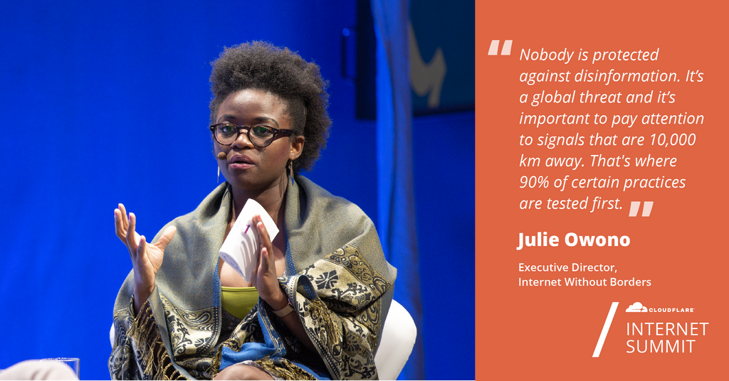 @Cloudflare#InternetSummit! Stopping the Global Spread of Disinformation, with@jsrailton (Senior Researcher at@citizenlab) and @JuliOwono (Executive Director,@internet_sf). Watch the livestream at https://cfl.re/2yeJxix pic.twitter.com/JRH4IHlmLy