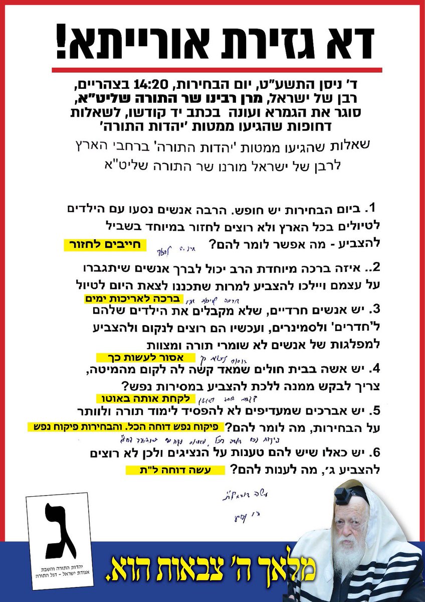 פרסום ראשון: שו״ת בחירות היום בכתב יד קודשו של שר התורה מרן הגאון רבי חיים קנייבסקי.pic.twitter.com/cesqQNaxuu