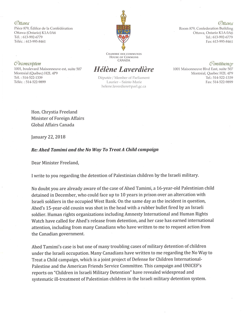 This week, Canadian MP Hélène Laverdière called on the Canadian government to press Israel to comply with international law in its treatment of Palestinian child detainees. http://bit.ly/2EaLeA6 cc