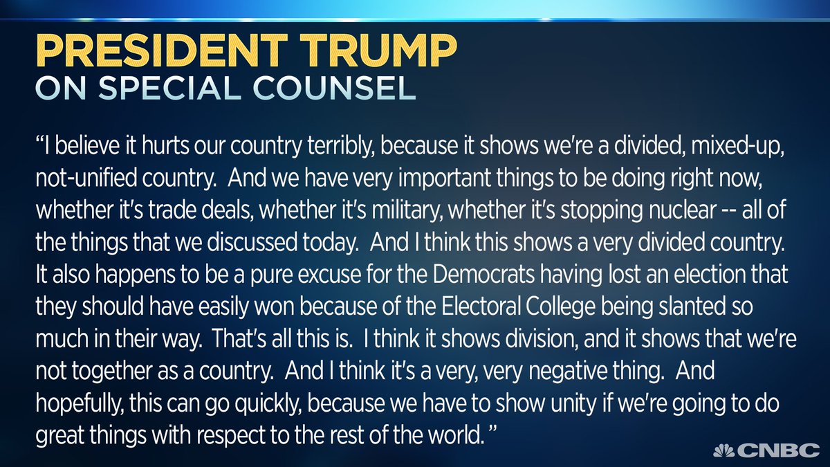 POTUS on special counsel: "I respect the move but the entire thing has been a witch hunt... I think it divides the country."