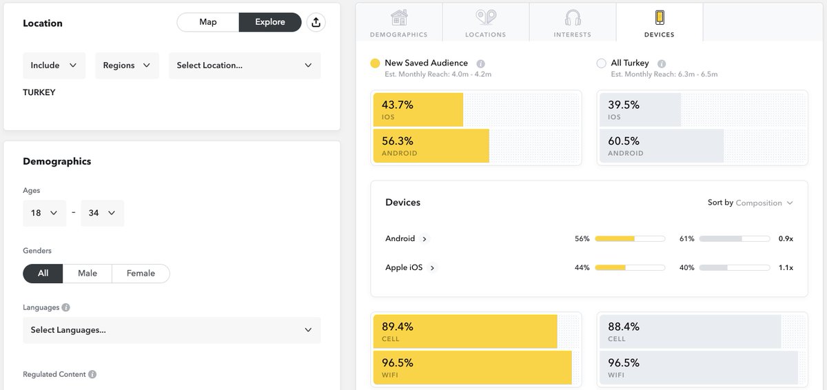 Facebook Audience Insight üzerinden aldığınız bilgileri Snapchat hedefleme ekranı üzerinden de kontrol etmenizi öneririm. "App Only" olduğu için özellikle mobile device'lar özelinde işe yarar içgörüler yakalayabilirsiniz.pic.twitter.com/3CemLHx0K5