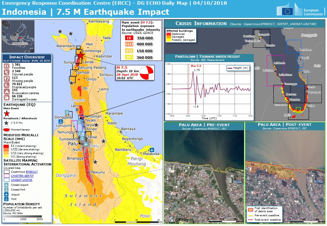 #SulawesiEarthquake and#tsunamiPalu as of 4/10: 1581 confirmed fatalities, 2549 people injured, 113 missing, 70821 displaced. The EU is channeling aid to those most affected (see thread).#EUCivPropic.twitter.com/GX2AufTh1H