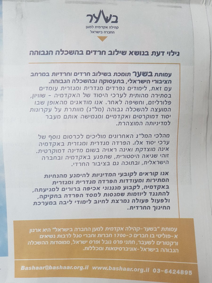 גילוי דעת של 1700 אנשי אקדמיה, לרבות חתני פרס נובל ופרס ישראל: "לימודים נפרדים מגדרית ומגזרית עומדים בסתירה לערכי היסוד של האקדמיה-שוויון, פלורליזם וחשיפה לאחר...הפרדה באקדמיה אינה מוצדקת ואינה ראויה בשום מדינה דמוקרטית. זוהי שגיאה היסטורית שתפגע באקדמיה ובחברה הישראלית" >>pic.twitter.com/9iOHYa3l19
