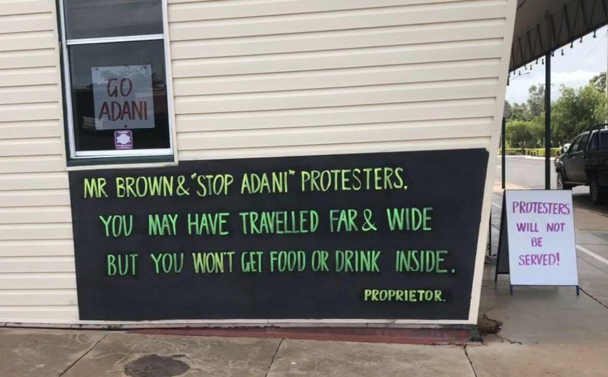 Clermont Qld has a message for the 'yoghurt knitter' convoy. Mr Brown & 'Stop Adani' Protestors You May Have Travelled Far & Wide But You Wont Get Food Or Drinks Insidepic.twitter.com/EucgGMmIFO