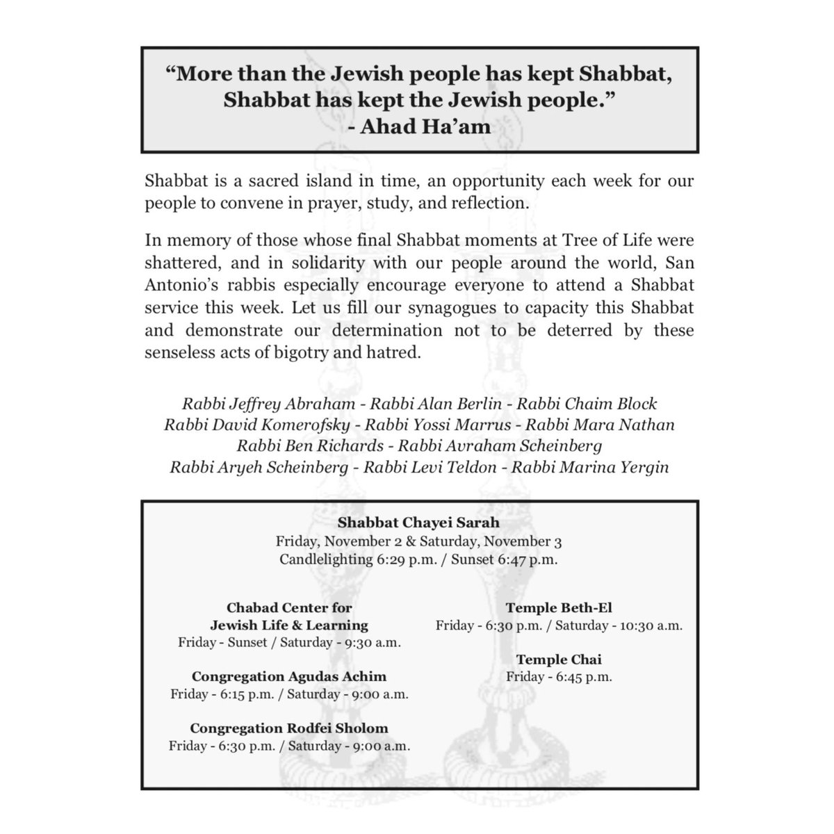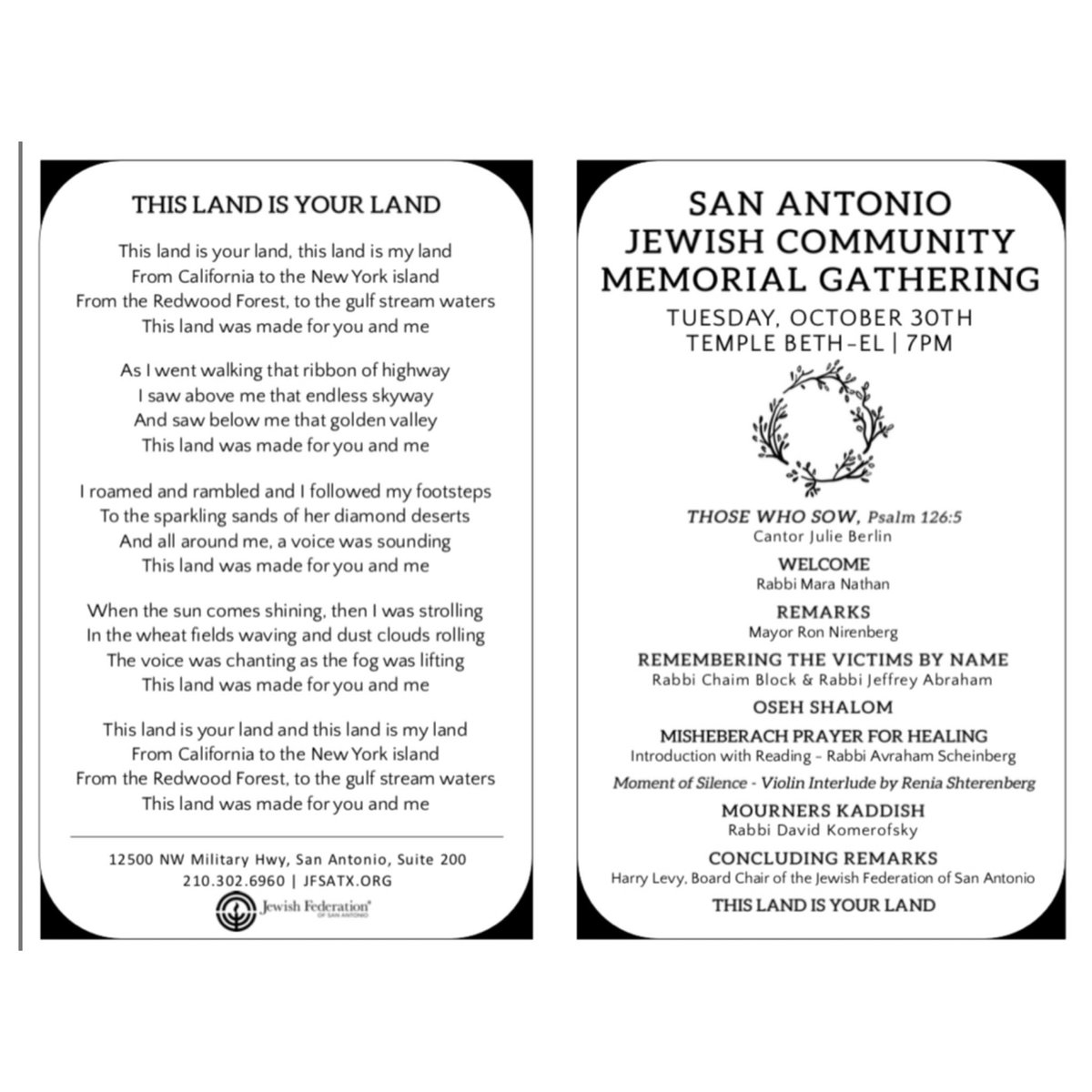 #SATX Jewish Community Memorial Gathering on our website, http://JFSATX.ORG for download. We have also included the insert calling for a Shabbat of Solidarity, Nov. 2-3.#PittsburgStrong#SolidarityShabbatpic.twitter.com/XeeRqoc46q