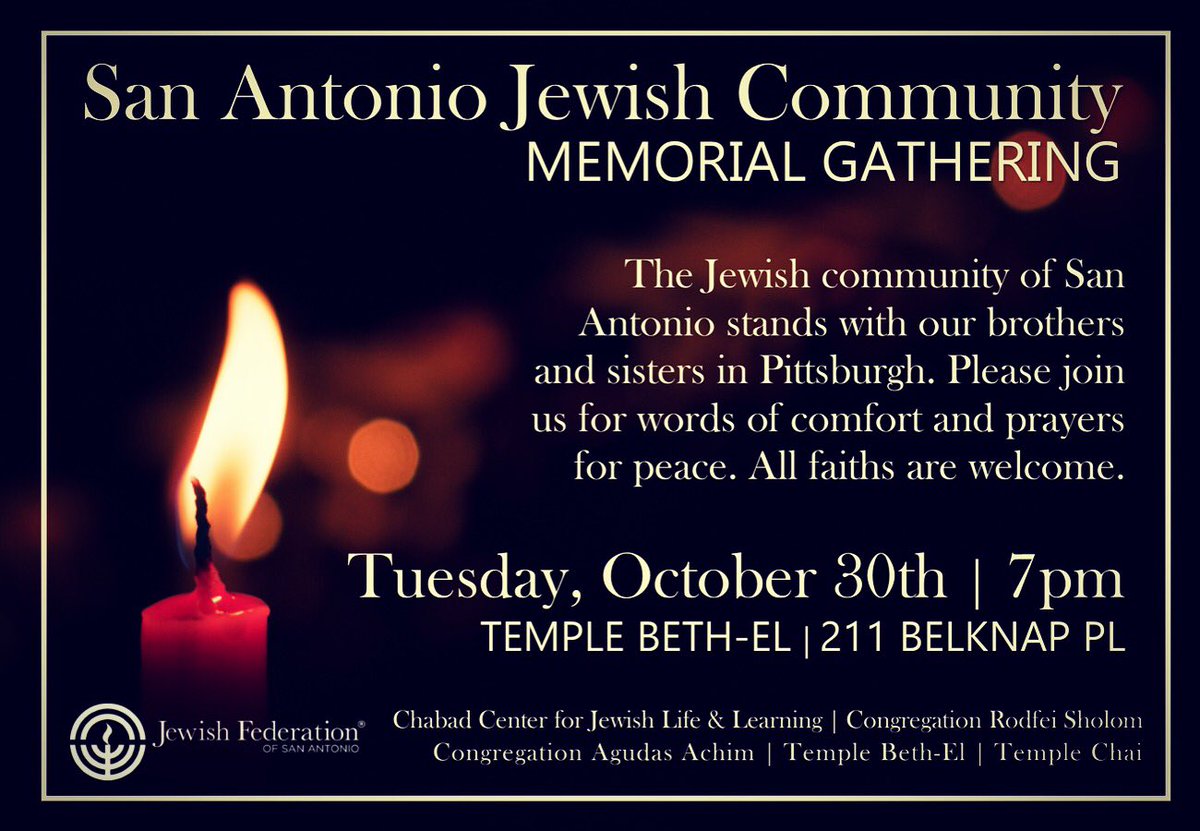 The San Antonio Jewish Community will be holding a memorial gathering at Temple Beth-El this Tuesday to honor the victims of the shooting at the Tree of Life Synagogue. All faiths are welcome & we hope to see you there.