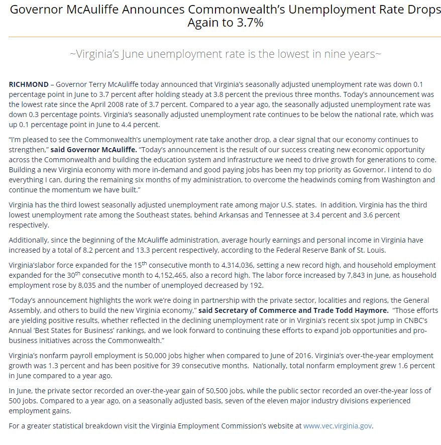 Governor McAuliffe Announces Commonwealth’s Unemployment Rate Drops Again to 3.7%