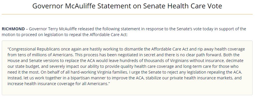 Below is the Gov's statement in response to the Senate's vote today in support of the motion to proceed on legislation to repeal the
