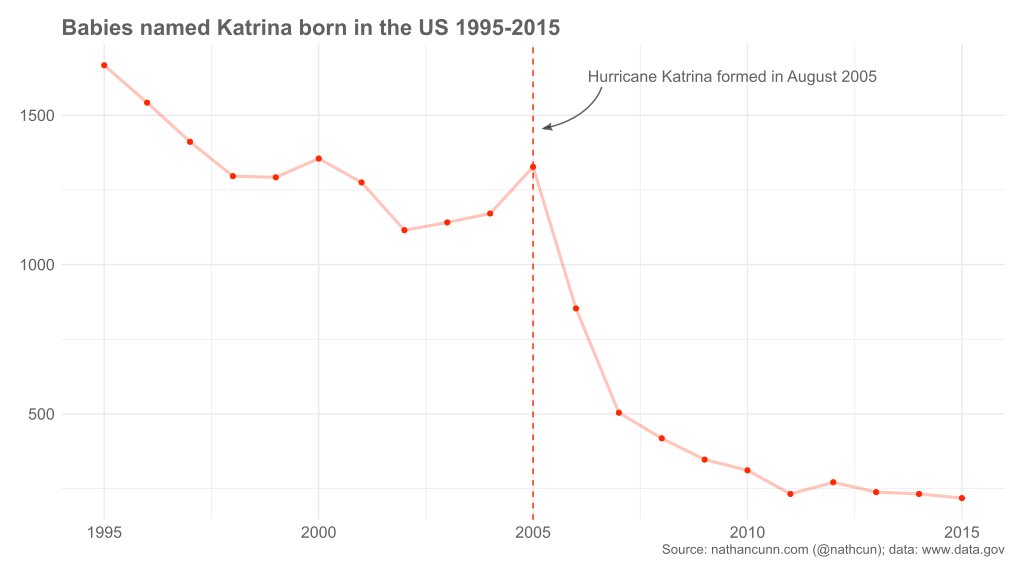There was a sharp decline in the number of babies named 'Katrina' immediately following Hurricane Katrina. https://buff.ly/2wTMCDD pic.twitter.com/ihaVUamiyF