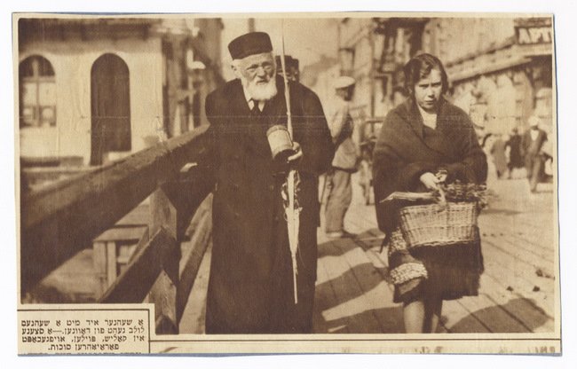 For those celebrating Sukkot/Sukes, a freylikhn yontif! Photo: On Sukkot, on old man returning from holiday services with a lulav and etrog and a woman with basket cross a wooden footbridge in Kalisz. Clipping 10.16.1932. Photo by Engel.