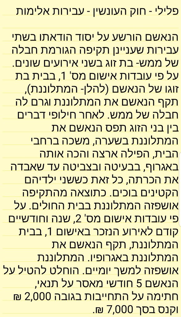 איך מטפלים באלימות נגד נשים? הנה דוגמא לפסק דין מהימים האחרונים: נאשם שמודה בהכאת זוגתו פעמיים לפחות, למול ילדיה, מביא לאובדן הכרתה וגורם לאשפוזה- ולא ירצה אף לא יום מאסר אחד!