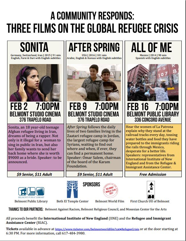 Beth El Temple Center,Belmont Public Library, The First Church in Belmont to host film festival to educate and promote refugee resettlement!pic.twitter.com/Q6UuTOO3aL