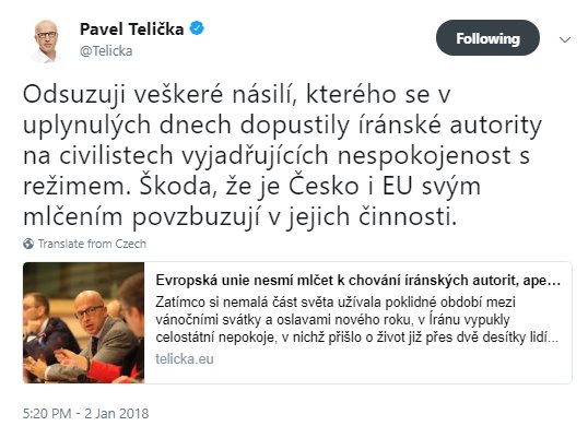 EP Vice-president Telicka: EU Must Not Be Silent About Behavior of Iranian Authorities Against Protesters.
